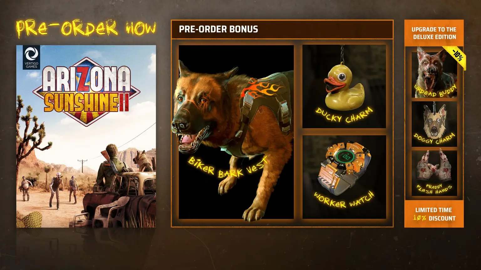 Предварительные заказы сегодня доступны в PlayStation Store для двух отличных изданий. Независимо от того, какое издание вы выберете, предварительный заказ Arizona Sunshine 2 дарит вам доступ к эксклюзивным предметам внутри игры для настройки вашей борьбы с нежитью.